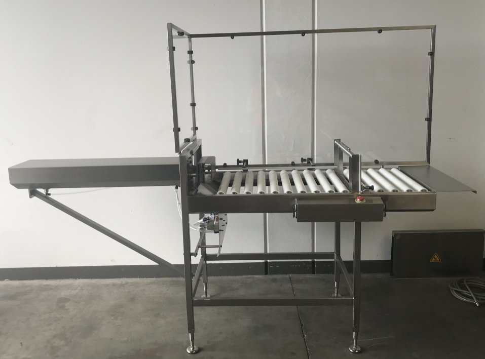 Der Käseblock wird manuell auf die unangetriebene Rollenbahn der MS142