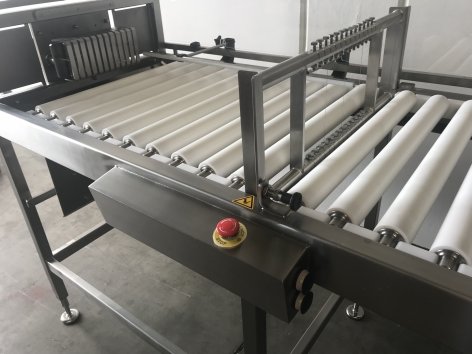- eine unangetriebene Rollenbahn auf der der Käseblock während